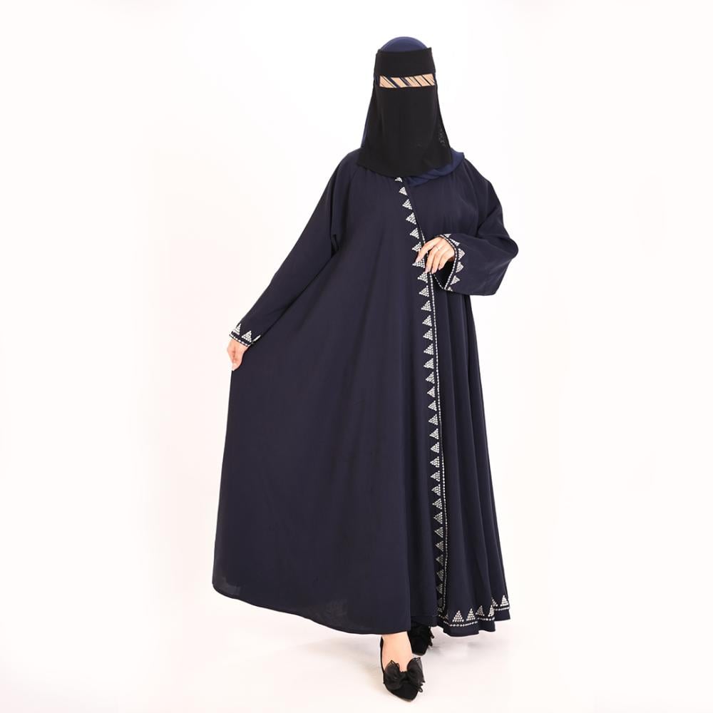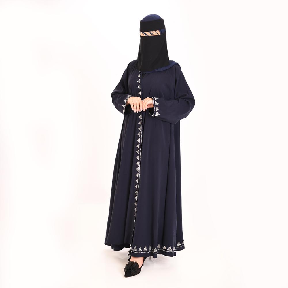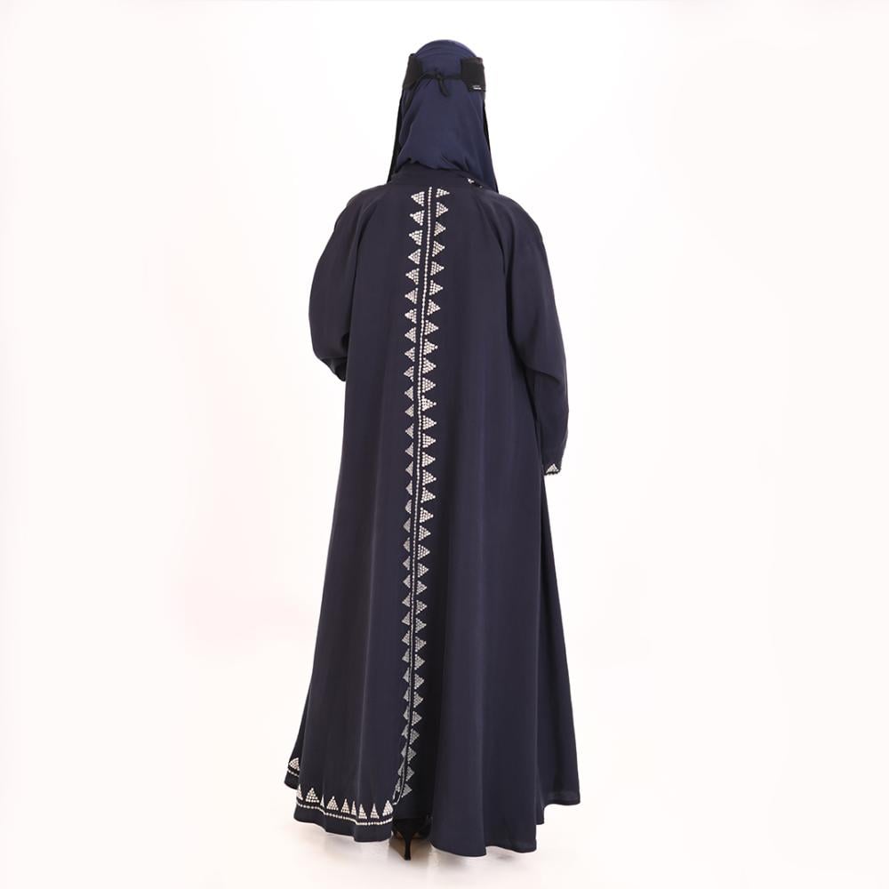 • التطريز: نمط متكرر باللون الأبيض المطفي على أطراف الأكمام ونهاية العباية والأطراف الأمامية